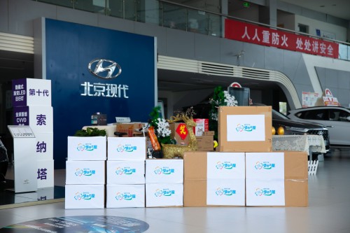 现代汽车车友代表向学生代表赠送爱心物资